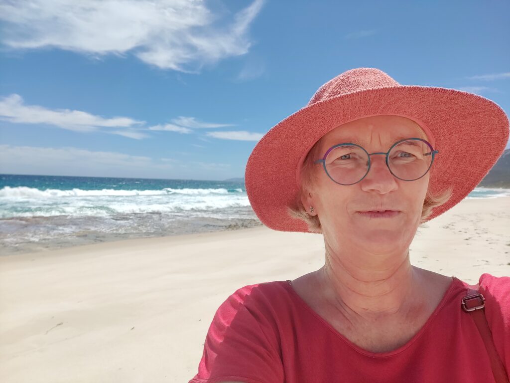 Heute Morgen machten wir einen Zwischenstopp an einem Strand, Normans Bay. So windig, dass mein neuer Hut mit Schutzfaktor 50+ wegzuwehen drohte. Menschenleer. Nach wenigen Minuten waren wir paniert, denn wir hatten reichlich von der Sonnencreme Gebrauch gemacht 😊