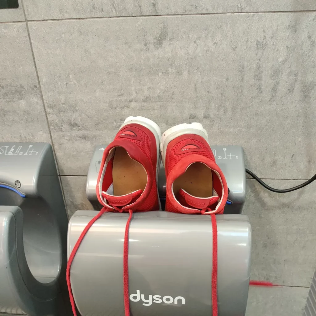 Für die Schuhe und Füße ergab sich zumindest temporär auch eine Lösung: Ich fand einen leeren „Restroom“ und steckte meine Schuhe und Socken in den Händetrockner. Ich hatte ganze 7 Minuten, bis eine asiatische Reisegruppe kam und ich den Händetrockner frei geben musste. Was für ein wohliges Gefühl trockene warme Socken😊 Hielt leider nur bis zum nächsten Außentermin…