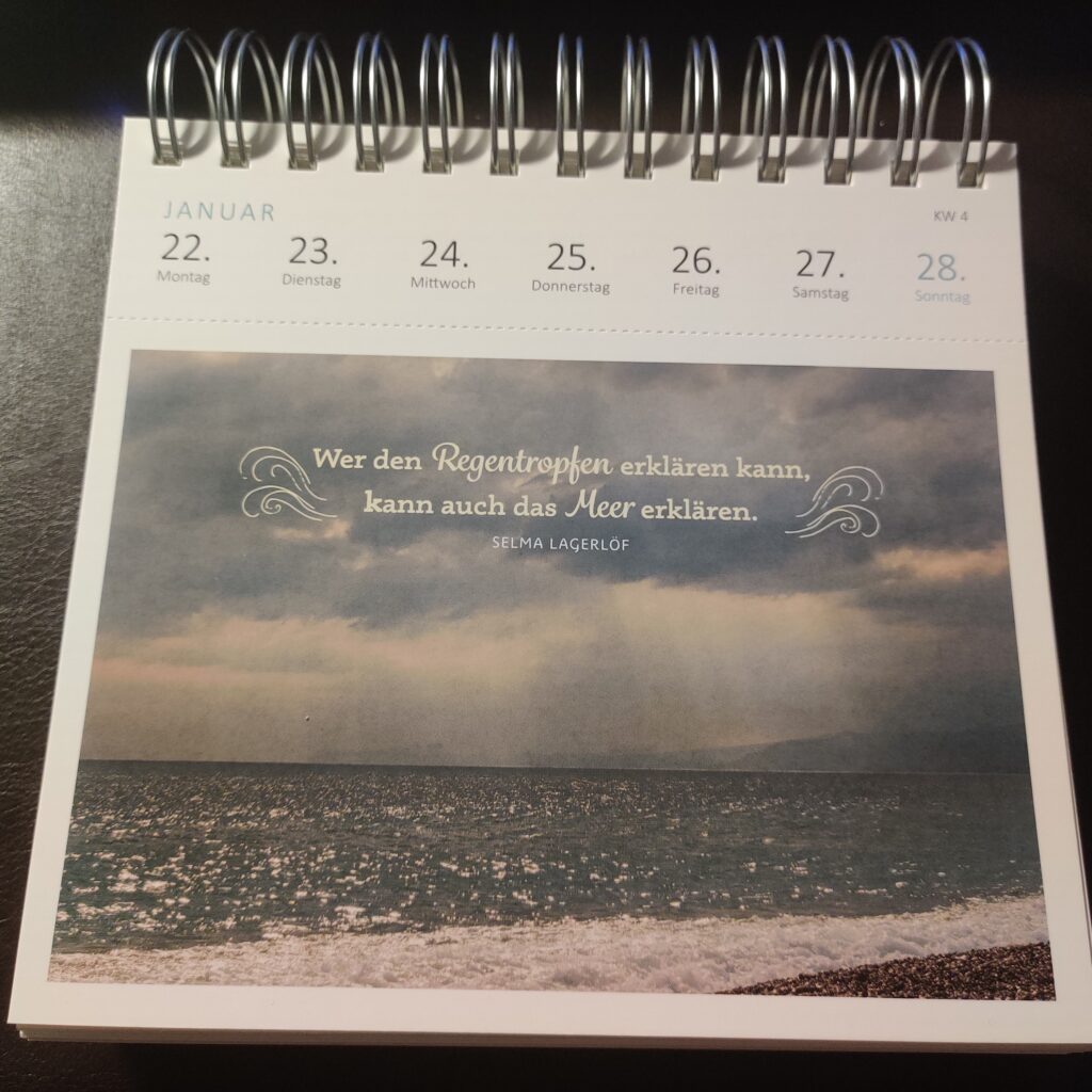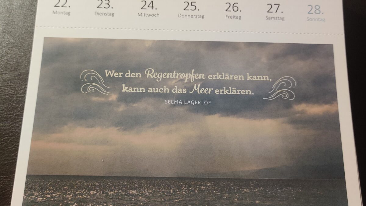 Aber ich möchte hier keine Werbung für Kalender machen, sondern etwas über Zeit schreiben, meine Zeit und ihre Wahrnehmung. Beim letzten Kalender durfte ich 3 Blätter entfernen, bis ich in der aktuellen Woche ankam. Drei Wochen vom Jahr schon um. Wo war diese Zeit geblieben? Ja, ich war im Urlaub insgesamt 45 Tage, jeweils 2 für den Hin- und Rückflug, aber der Rest? Heute nur noch eine verschwommene Erinnerung, wenn ich mir nicht die Fotos oder die Reisebeschreibung anschaue. Der Kopf ist vom Jetlag allerding auch erst seit kurzem wieder befreit.