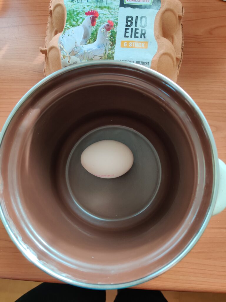 Jetzt! Löffel in die Hand, Ei aus dem köchelnden Wasser, geschafft. Ab in den letzten verbliebenen Eierbecher. Triumphierend stellte ich das Ei vor ihn hin. „So, nächstes Mal gibt es Rührei.“ Griff mir eine mitgebrachte Semmel und begann mit dem Frühstück. Gespannt, ob das für heute alles sein würde 😉