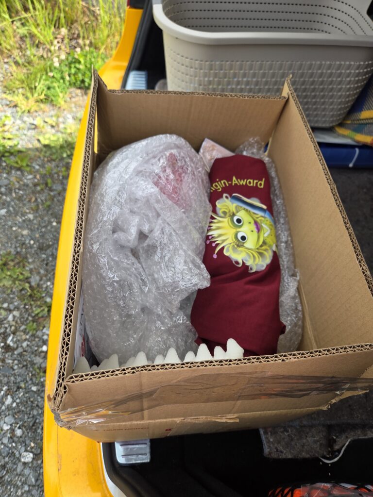 Gestern dann bei IKEA in Großburgwedel auf dem Parkplatz das, weswegen wir überhaupt die Fahrt in den Norden unternommen hatten: Übergabe der Trophäe „Tod und Verderben“ an die Autorin des Siegerbuchs in dieser Kategorie. Ja, es war schön diese Frau zu treffen, wenn auch nur kurz. Ein bisschen zu plaudern, auch wenn die nebenstehenden Söhne mehr oder weniger mit den Hufen scharrten.