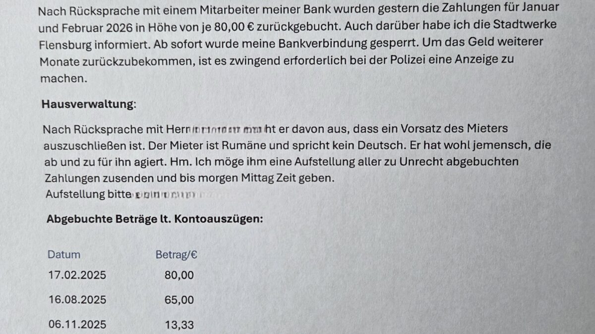 Zum dritten Mal in Folge 80,00 € für die Stadtwerke Flensburg, Zahlungspflichtiger mein Mieter!