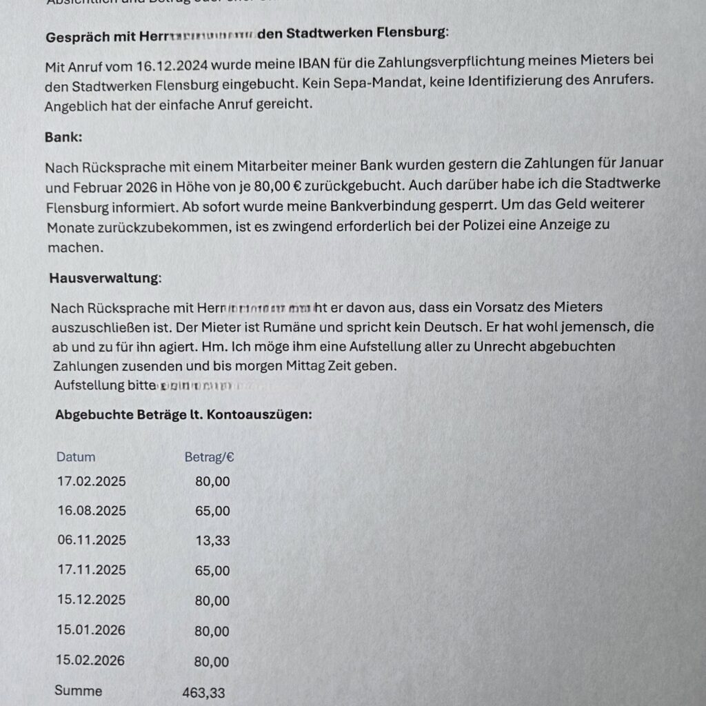 Zum dritten Mal in Folge 80,00 € für die Stadtwerke Flensburg, Zahlungspflichtiger mein Mieter!